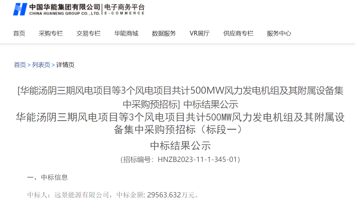 公告顯示,遠景能源有限公司成功中標該項目,中標價格為29563.632萬元。