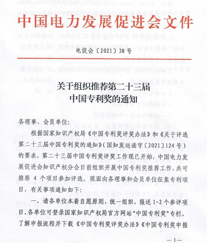 三、請申報單位按照要求,認真填寫《中國專利獎申報書》及相關材料,推薦單位填寫“中國電力發(fā)展促進會”。請于2021年10月15日前將申報資料紙質版一式兩份加蓋公章后送至我會,并附電子版U盤存儲,包含: