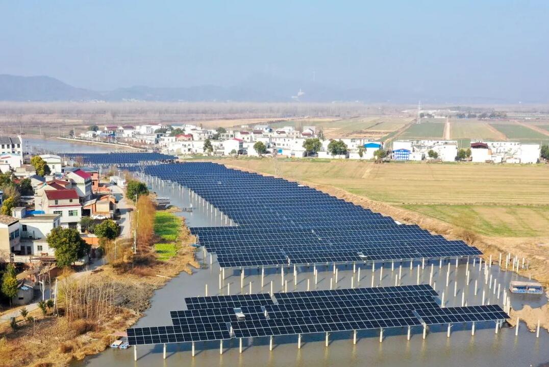 鏡頭調(diào)轉(zhuǎn)至安徽安慶皖河,河水波光粼粼,作業(yè)船穿梭其間,挖掘機、推土機、打樁機發(fā)出陣陣轟鳴,整齊排列的光伏板在春日暖陽下等待能量的蓄積,由中國能建安徽電建二公司承建的安徽安慶皖河200兆瓦光伏發(fā)電項目在春日陽光的照射下,正煥發(fā)出勃勃生機。