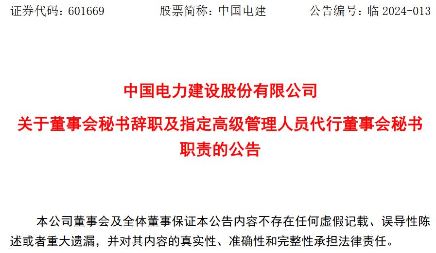 中國(guó)電建發(fā)布公告稱,中國(guó)電力建設(shè)股份有限公司(以下簡(jiǎn)稱“公司”)董事會(huì)秘書(shū)丁永泉先生因年齡原因(退休)已向公司董事會(huì)遞交書(shū)面辭職報(bào)告,申請(qǐng)辭去公司董事會(huì)秘書(shū)職務(wù)。