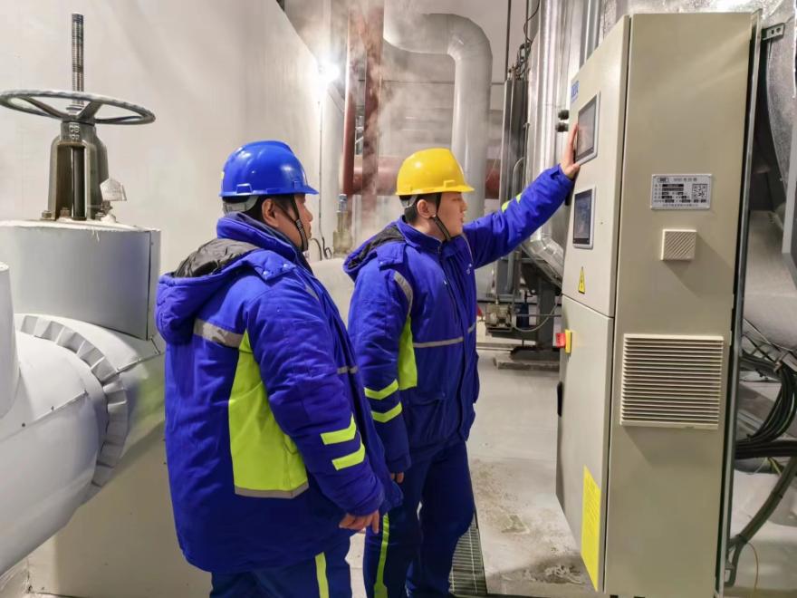 中國(guó)節(jié)能所屬中國(guó)環(huán)保行唐公司運(yùn)行人員檢查供熱首站運(yùn)行狀態(tài)