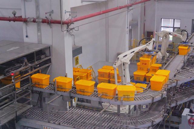 當(dāng)一輛裝載著醫(yī)療廢物的運(yùn)輸車(chē)進(jìn)入廠區(qū)后,車(chē)廂門(mén)一打開(kāi),負(fù)責(zé)卸貨的機(jī)械臂便迅速啟動(dòng),通過(guò)自身配備的攝像頭對(duì)周轉(zhuǎn)箱進(jìn)行拍照識(shí)別并完成自動(dòng)抓取,裝有醫(yī)療廢物的黃色周轉(zhuǎn)箱隨即被放置于輸送線上。為了保證各個(gè)環(huán)節(jié)的無(wú)縫對(duì)接,園區(qū)特別定制了24000個(gè)固定尺寸的周轉(zhuǎn)箱,確保從收集、運(yùn)輸?shù)教幚淼娜^(guò)程順利進(jìn)行。