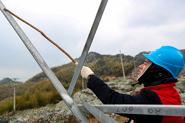 巡線員們一路踏冰前行,一路巡視線路和鐵塔,每到一基桿塔就利用望遠(yuǎn)鏡、測距儀等工具詳細(xì)監(jiān)測冰情,仔細(xì)觀察是否有安全隱患,并用手機(jī)拍攝下來,同時(shí)也對(duì)基礎(chǔ)、導(dǎo)地線、桿塔、金具絕緣子及接地裝置進(jìn)行了全面“問診”。如果遇到樹竹倒伏在線路上方位,還要現(xiàn)場進(jìn)行清理,以免影響線路的安全穩(wěn)定運(yùn)行。