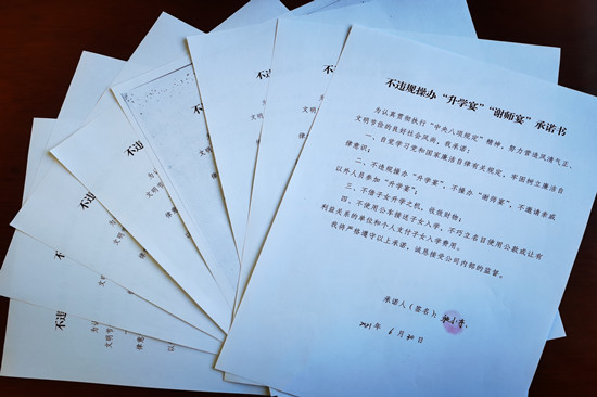除短信提醒墻外,該公司黨總支重申紀律要求,組織對公司全體干部員工對家中有升學子女的職工向公司黨總支備案,督促簽訂《不違規(guī)操辦“升學宴”“謝師宴”承諾書》8份,并開展集體約談,予以重點監(jiān)督。
