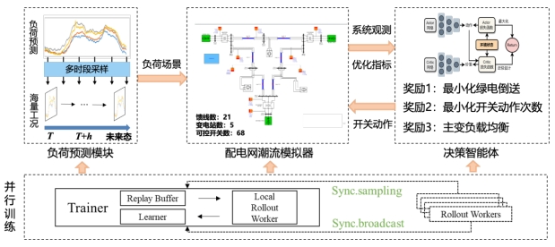 在“調(diào)度智能體”建設(shè)的過(guò)程中,為應(yīng)對(duì)指數(shù)級(jí)增長(zhǎng)的新型設(shè)備對(duì)象所產(chǎn)生的大量數(shù)據(jù)計(jì)算任務(wù),國(guó)網(wǎng)浙江省電力有限公司紹興供電公司在測(cè)試開(kāi)發(fā)多種算法,比較、優(yōu)化、迭代后,選擇采用強(qiáng)化學(xué)習(xí)AI算法PPO(近端策略優(yōu)化)為核心算法來(lái)訓(xùn)練“調(diào)度智能體”。綜合電網(wǎng)預(yù)測(cè)、潮流推演等結(jié)果,計(jì)算區(qū)域主配網(wǎng)運(yùn)行方式優(yōu)化策略,輸出主配網(wǎng)開(kāi)關(guān)調(diào)節(jié)執(zhí)行指導(dǎo)方案,在實(shí)時(shí)、超短期、日前等三個(gè)時(shí)間尺度下給出新能源消納的最優(yōu)通道。
