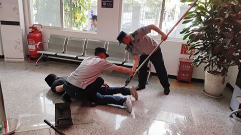 在反恐怖襲擊演練中,本次演練以該局鳳慶營業(yè)廳內突然出現(xiàn)2名不明身份窮兇極惡的持刀恐怖分子,挾持1名安保人員為演練假定場景。演練營業(yè)廳值班人員信息報告、應急響應啟動、人身救援、通訊聯(lián)絡等現(xiàn)場應急處置過程。演練現(xiàn)場, 2名持刀窮兇極惡的恐怖分子以辦事為由,在保安人員正當詢問及登記之際,恐怖分子手持管制刀具強行推開營業(yè)廳門闖入廳內,企圖用砍刀襲擊現(xiàn)場保安工作人員并直奔營業(yè)廳平臺破壞電力營業(yè)收費管理正常秩序。營業(yè)廳工作人員立即向應急辦值班室匯報,應急辦主任聽取應急辦值班室匯報后,立即做出啟動生產辦公場所反恐怖襲擊事件(四級)應急響應的決定,安排有關保安和工作人員對現(xiàn)場進行處置,保安人員并及時持盾牌、鋼叉等警用設備與暴徒對峙,采取應急處置措施,終將恐怖分子制服。