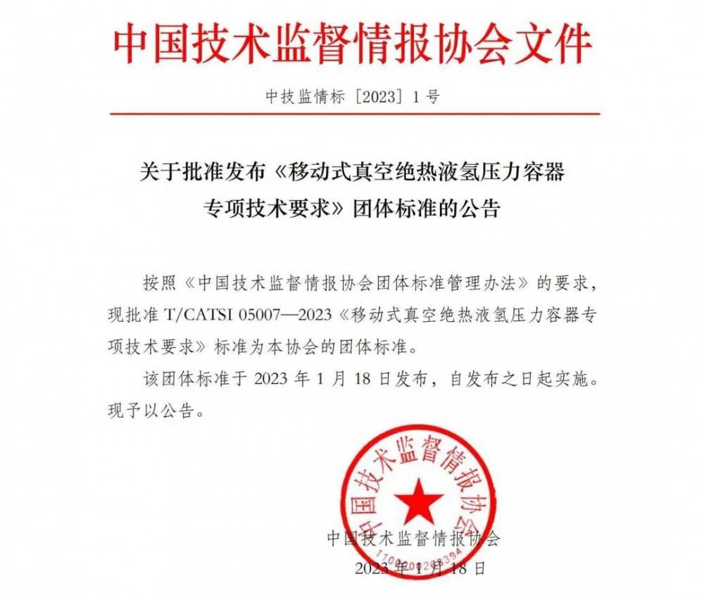 近日,中國技術監(jiān)督情報協(xié)會正式發(fā)布T/CATSI 05007—2023《移動式真空絕熱液氫壓力容器專項技術要求》團體標準(以下簡稱“標準”),自發(fā)布之日起正式實施。該標準由中集安瑞科旗下南通中集能源裝備有限公司(簡稱”南通能源“)牽頭起草。