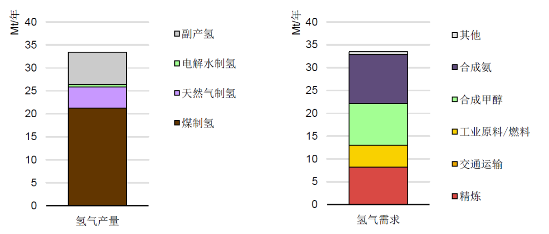 氫是重要工業(yè)原料,在合成氨、合成甲醇、石油煉化中廣泛使用,也是金屬冶煉的重要原料,廣泛用于鎢、鉬、鈷、鐵等金屬和鍺、硅的生產(chǎn)。根據(jù)國際能源署(IEA)統(tǒng)計(jì)數(shù)據(jù),中國2020年氫氣生產(chǎn)和消費(fèi)量約3300萬噸,生產(chǎn)方面絕大多數(shù)來自于煤、天然氣等化石能源,消費(fèi)方面主要是合成氨、合成甲醇、石油煉化等。