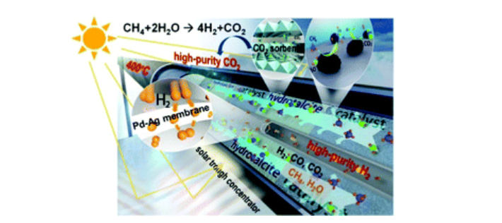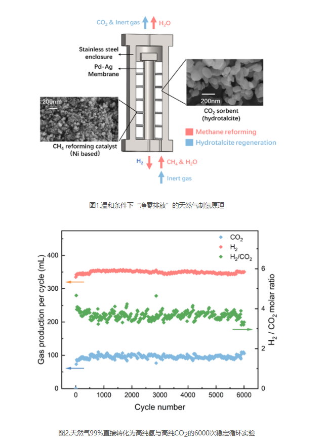 中國(guó)科學(xué)院工程熱物理研究所首次實(shí)現(xiàn)了400°C溫和條件下“凈零排放”的天然氣制氫原理突破。通過(guò)有序分離氫氣和二氧化碳產(chǎn)物,天然氣制氫反應(yīng)溫度由傳統(tǒng)的800-1000°C降至400°C以下,實(shí)現(xiàn)了99%以上甲烷直接轉(zhuǎn)化為高純氫與高純二氧化碳,并實(shí)現(xiàn)了基于化石能源的制氫與脫碳的完全協(xié)同。制氫與脫碳能耗下降幅度達(dá)20-40%。基于此,該工作結(jié)合商業(yè)化中溫槽式聚光技術(shù),實(shí)現(xiàn)了太陽(yáng)能驅(qū)動(dòng)的天然氣制氫與脫碳,進(jìn)一步減少化石能源制氫的碳足跡,展示了化石能源與可再生能源互補(bǔ)實(shí)現(xiàn)可持續(xù)氫能利用的可行性。反應(yīng)溫度的降低使工業(yè)余熱與氫能的結(jié)合成為可能。迄今為止,研究人員已完成了超過(guò)6000次的穩(wěn)定循環(huán)實(shí)驗(yàn),驗(yàn)證了該方法的可靠性,并初步展示了技術(shù)轉(zhuǎn)化應(yīng)用的廣闊前景。
