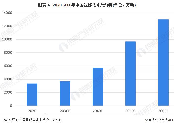 根據(jù)中國氫能聯(lián)盟的預(yù)測,2020 年以后中國氫能需求將持續(xù)增加,尤其是 2030 年以后,為達(dá)成 " 碳中和、碳達(dá)峰 " 的目標(biāo),氫能需求量將大增。到 2060 年,中國氫能年需求將超過 1.3 億噸。