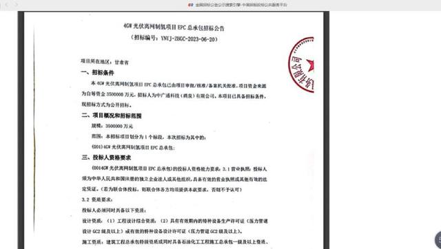 6月21日,一份甘肅4GW光伏離網(wǎng)制氫項目EPC總承包招標(biāo)公告,在中國招標(biāo)投標(biāo)公共服務(wù)平臺發(fā)布。文件顯示招標(biāo)主體為中廣通科技(酒泉)有限公司(以下簡稱“中廣通酒泉”),該項目資金來源為自籌資金350億。