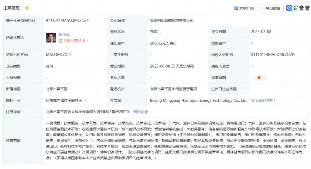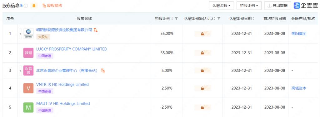 據(jù)企查查顯示,8 月 8 日,北京明陽氫能科技有限公司注冊成立,該公司注冊資本 2000 萬元,由風電龍頭企業(yè)明陽集團、祿順有限公司(LUCKY PROSPERITY COMPANY LIMITED)、北京永氫宏企業(yè)管理中心 ( 有限合伙 ) 等多家單位共同持股,其中明陽集團持有 55% 股份、為最大股東,明陽集團董事長張傳衛(wèi)擔任該公司法定代表人。