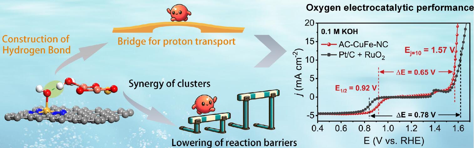 基于此,研究工作2報(bào)道了一種原子全暴露的Fe摻雜的CuO團(tuán)簇與單原子位點(diǎn)協(xié)同的新型催化劑。實(shí)驗(yàn)和DFT計(jì)算表明:一方面,協(xié)同的Cu-O-Fe 團(tuán)簇能有效誘導(dǎo)鐵單原子位點(diǎn)的電子結(jié)構(gòu)重新分布、調(diào)節(jié)氧吸附能并降低 ORR 勢壘;另一方面,譜學(xué)表征和理論計(jì)算表明Cu-O-Fe團(tuán)簇協(xié)同構(gòu)建了含氧反應(yīng)中間體與電解質(zhì)分子之間的氫鍵,所構(gòu)建的氫鍵不僅可以穩(wěn)定含氧反應(yīng)中間體,同時拉伸了ORR最后一步的Fe-O鍵長,有助于OH*的脫附;更為質(zhì)子傳輸提供了通道,提高了反應(yīng)動力學(xué)。這項(xiàng)研究中展示的新穎的催化劑結(jié)構(gòu)和協(xié)同機(jī)制,為開發(fā)綠色能源轉(zhuǎn)換裝置中的高性能催化劑提供了新的視角和參考。