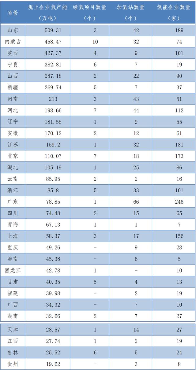 根據(jù)氫能產(chǎn)業(yè)大數(shù)據(jù)平臺(tái)數(shù)據(jù),山東、內(nèi)蒙古和陜西三地規(guī)模以上企業(yè)氫產(chǎn)能分別達(dá)到509.31萬噸、458.47萬噸和427.37萬噸,氫氣產(chǎn)能排名全國第一名、第二名和第三名。