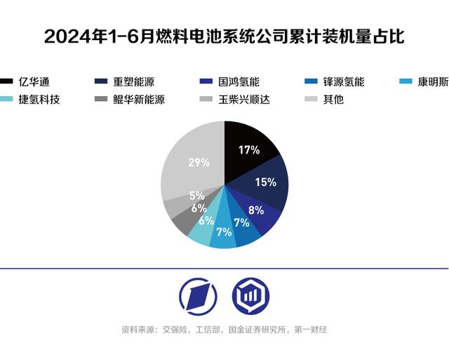 但燃料電池系統(tǒng)供應商的競爭格局仍在不斷變化中。2024年1-6月,國內燃料電池系統(tǒng)公司累計裝機量排名,億華通作為龍頭繼續(xù)保持第一,2-6名分別為重塑能源、國鴻氫能、鋒源氫能、康明斯、捷氫科技,而2023年2-6名分別為捷氫科技、重塑能源、國鴻氫能、濰柴動力、未勢能源。