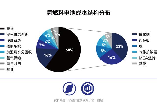 和鋰電、光伏產業(yè)相似,燃料電池走向大規(guī)模市場化的主要路徑是降低成本。根據(jù)華經產業(yè)研究院數(shù)據(jù),氫燃料電池成本構成中,電堆是最大構成部分,占比約60%;在電堆成本構成中,催化劑、雙極板和交換膜是主要成本來源,占總燃料電池成本比例分別為23%、16%和8%。
