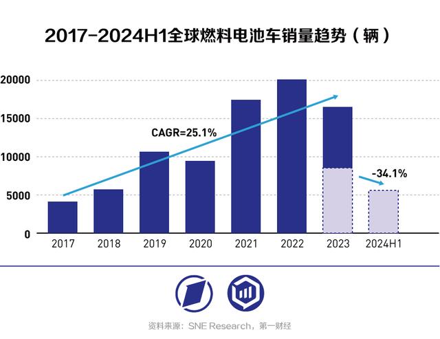 氫燃料電池車作為現(xiàn)階段燃料電池系統(tǒng)的主要應用領域,二者表現(xiàn)高度相關。全球氫燃料電池車在2023年和2024年上半年銷量均出現(xiàn)收縮趨勢。根據(jù)SNE Research的數(shù)據(jù),2022年氫燃料電池車全球銷售20704輛,創(chuàng)歷史新高,此后開始走低;2023年降至16413輛,同比下滑20.7%;2024年上半年該數(shù)字為5621輛,同比下滑34.1%。