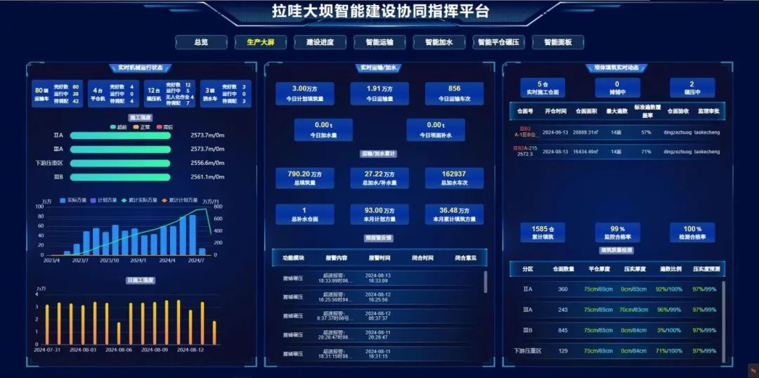 為保障世界級(jí)工程高效率高質(zhì)量建設(shè),項(xiàng)目團(tuán)隊(duì)不斷優(yōu)化施工規(guī)劃,全面應(yīng)用無人碾壓、智能物料、智能加水、智能攤鋪等技術(shù)聯(lián)動(dòng)的智慧大壩協(xié)同指揮平臺(tái),全方位提升大壩填筑效率與質(zhì)量。截至目前,拉哇水電站大壩日填筑方量已突破3萬方,月填筑方量接近100萬方,月上升高度超過13.2米,為目前國內(nèi)上升速度最快的混凝土面板堆石壩。