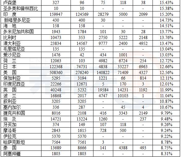 表2列出了154個(gè)國(guó)家的再生能源發(fā)電量,并有占發(fā)電總量的百分率;而且有再生能源發(fā)電總量的構(gòu)成。數(shù)據(jù)取自2012~2015年各國(guó)的數(shù)據(jù),當(dāng)然數(shù)據(jù)會(huì)不斷更新,但只會(huì)更好。由于地?zé)岚l(fā)電量小,未列入表中。