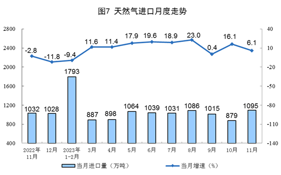 1—11月份,生產(chǎn)天然氣2096億立方米,同比增長6.0%。進口天然氣10740萬噸,同比增長8.5%。