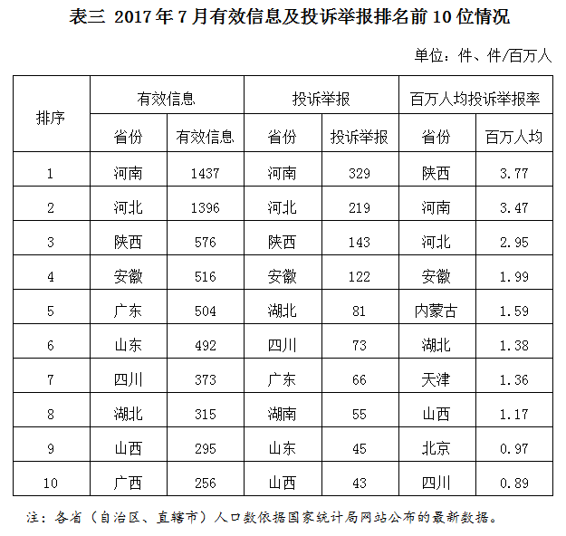 各?。ㄗ灾螀^(qū)、直轄市)按照收到的有效信息數(shù)量排序,河南、河北、陜西、安徽、廣東等省列全國(guó)前10位;按照投訴舉報(bào)數(shù)量排序,河南、河北、陜西、安徽、湖北等省排在全國(guó)前10位。按照百萬(wàn)人均投訴舉報(bào)率排序,陜西、河南、河北、安徽、內(nèi)蒙古等省位于全國(guó)前10位。(2017年7月有效信息及投訴舉報(bào)排名前10位情況見(jiàn)表三)