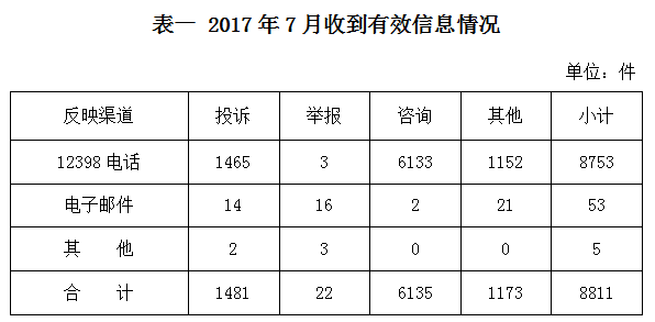 按反映渠道分類,12398電話8753件,電子郵件53件,其他5件。(2017年7月收到有效信息情況見(jiàn)表一)