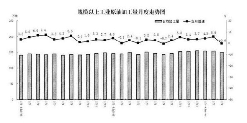 原油加工量下降。4月份,原油加工量4445.2萬噸,同比下降0.6%;日均加工量148.2萬噸,比3月份下降3.3%,這主要是受部分大型石化企業(yè)停產檢修影響。主要成品油生產也有所回落,其中,汽油產量同比下降4.0%,煤油產量增長2.2%,柴油產量下降0.6%。1-4月份,原油加工量18251.0萬噸,同比增長3.1%,比1-3月份回落1.4個百分點。