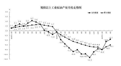 原油生產降幅收窄,進口增長較快。4月份,原油產量1599.0萬噸,同比下降3.7%,降幅比3月份收窄0.9個百分點。1-4月份,原油產量6400.9萬噸,同比下降6.1%。進口13912萬噸,同比增長12.5%。