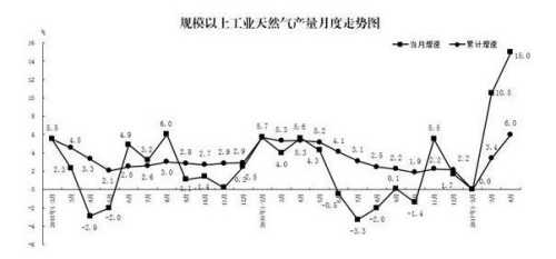 1-4月份,天然氣產量509.4億立方米,同比增長6.0%。進口2011萬噸[4],增長5.4%。