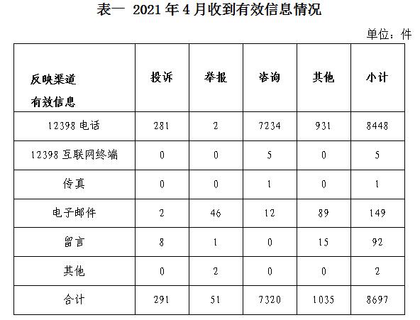 2021年4月,國家能源局12398能源監(jiān)管熱線(以下簡稱12398熱線)共收到有效信息8697件(包含投訴、舉報(bào)、咨詢和其他訴求類別),環(huán)比增加3.13%,同比減少1.43%。(2021年4月收到有效信息情況見表一)