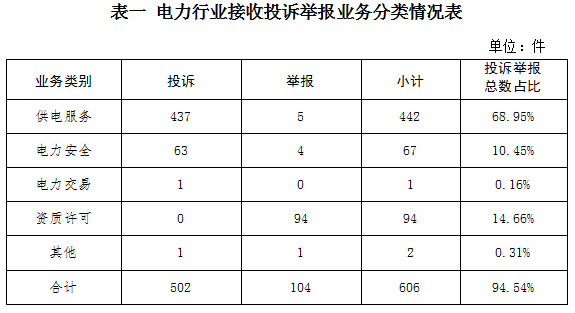 電力行業(yè)排在首位,數(shù)量為606件、占投訴舉報總數(shù)的94.54%,主要集中在供電服務(wù)、資質(zhì)許可、電力安全、電力交易等方面。