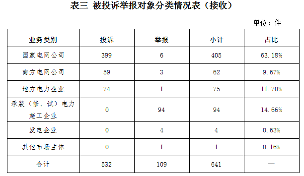 供電企業(yè)542件、占投訴舉報總數(shù)的84.55%,其中國家電網(wǎng)公司405件、占投訴舉報總數(shù)的63.18%,南方電網(wǎng)公司62件、占投訴舉報總數(shù)的9.67%,地方電力企業(yè)75件、占投訴舉報總數(shù)的11.70%;承裝(修、試)電力施工企業(yè)94件、占投訴舉報總數(shù)的14.66%;發(fā)電企業(yè)4件、占投訴舉報總數(shù)的0.63%;其他市場主體1件、占投訴舉報總數(shù)的0.16%。