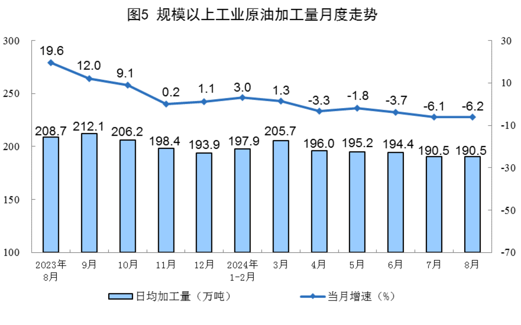 原油生產(chǎn)穩(wěn)定增長。8月份,規(guī)上工業(yè)原油產(chǎn)量1783萬噸,同比增長2.1%;日均產(chǎn)量57.5萬噸。進(jìn)口原油4910萬噸,同比下降7.0%。