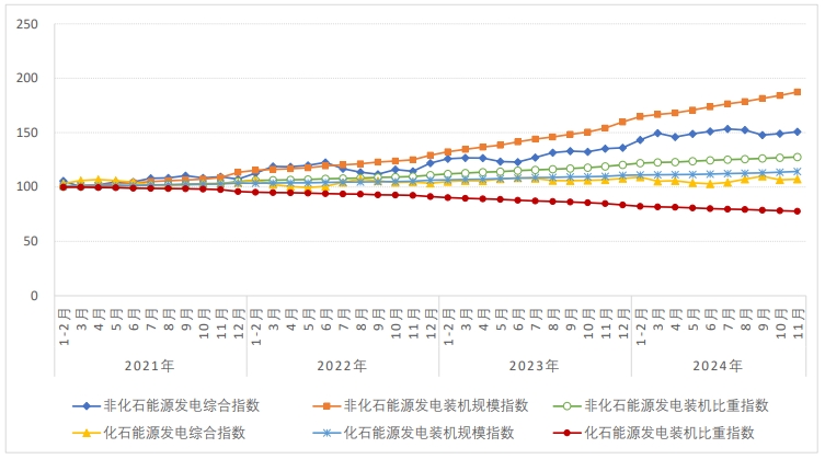 化石能源發(fā)電裝機(jī)規(guī)模指數(shù)為114.3,“十四五”以來化石能源發(fā)電裝機(jī)規(guī)模累計增長了14.3%,同比增長4.0%。化石能源發(fā)電裝機(jī)比重指數(shù)為77.7,“十四五”以來化石能源發(fā)電裝機(jī)比重累計下降了22.3%(比重從2020年底的55.2%降至2024年11月底的42.9%),隨著新能源裝機(jī)的快速增長,化石能源裝機(jī)比重持續(xù)下降。