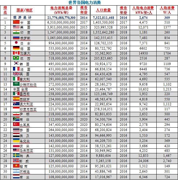 本表以電力消費(fèi)總量排序,中國(guó)居第一、美國(guó)第二、印度第三。