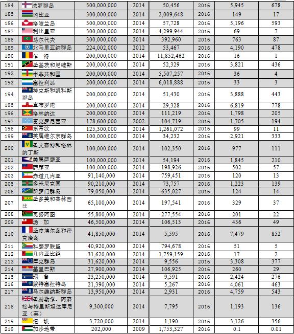 本文數(shù)據(jù)主要由美國(guó)中央情報(bào)局(CIA)統(tǒng)計(jì),但個(gè)別國(guó)家如中國(guó)、印度尼西亞、阿聯(lián)酋、菲律賓、尼泊爾、北馬里亞納群島等由該國(guó)的統(tǒng)計(jì)機(jī)構(gòu)統(tǒng)計(jì)。