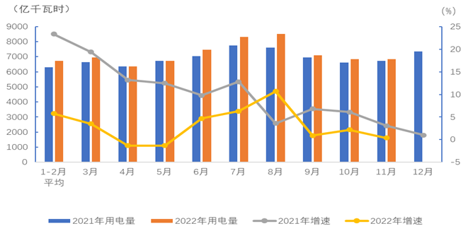 圖1 2021、2022年分月全社會(huì)用電量及其增速