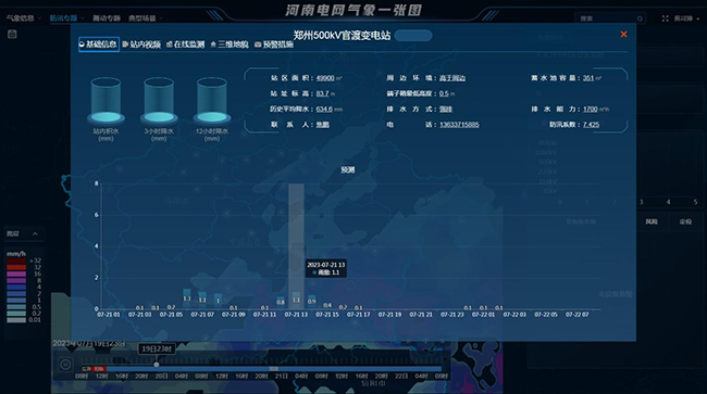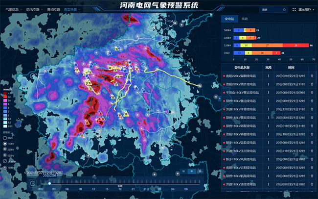 “一張圖”建設(shè)以電網(wǎng)氣象災(zāi)害風險預(yù)報預(yù)警模型為核心,集夏季防汛、冬季覆冰舞動、春秋季風災(zāi)等多種電網(wǎng)氣象災(zāi)害風險預(yù)報預(yù)警于一體,預(yù)警信息的地理精度可具體到變電站、線路桿塔。通過平臺可實時捕捉電網(wǎng)設(shè)備的氣象要素監(jiān)測和預(yù)報信息,以及變電站周邊環(huán)境監(jiān)控等。當出現(xiàn)重大天氣過程時,平臺根據(jù)不同風險等級預(yù)測,動態(tài)提供“一站一策式”的24小時、72小時內(nèi)應(yīng)對措施建議。
