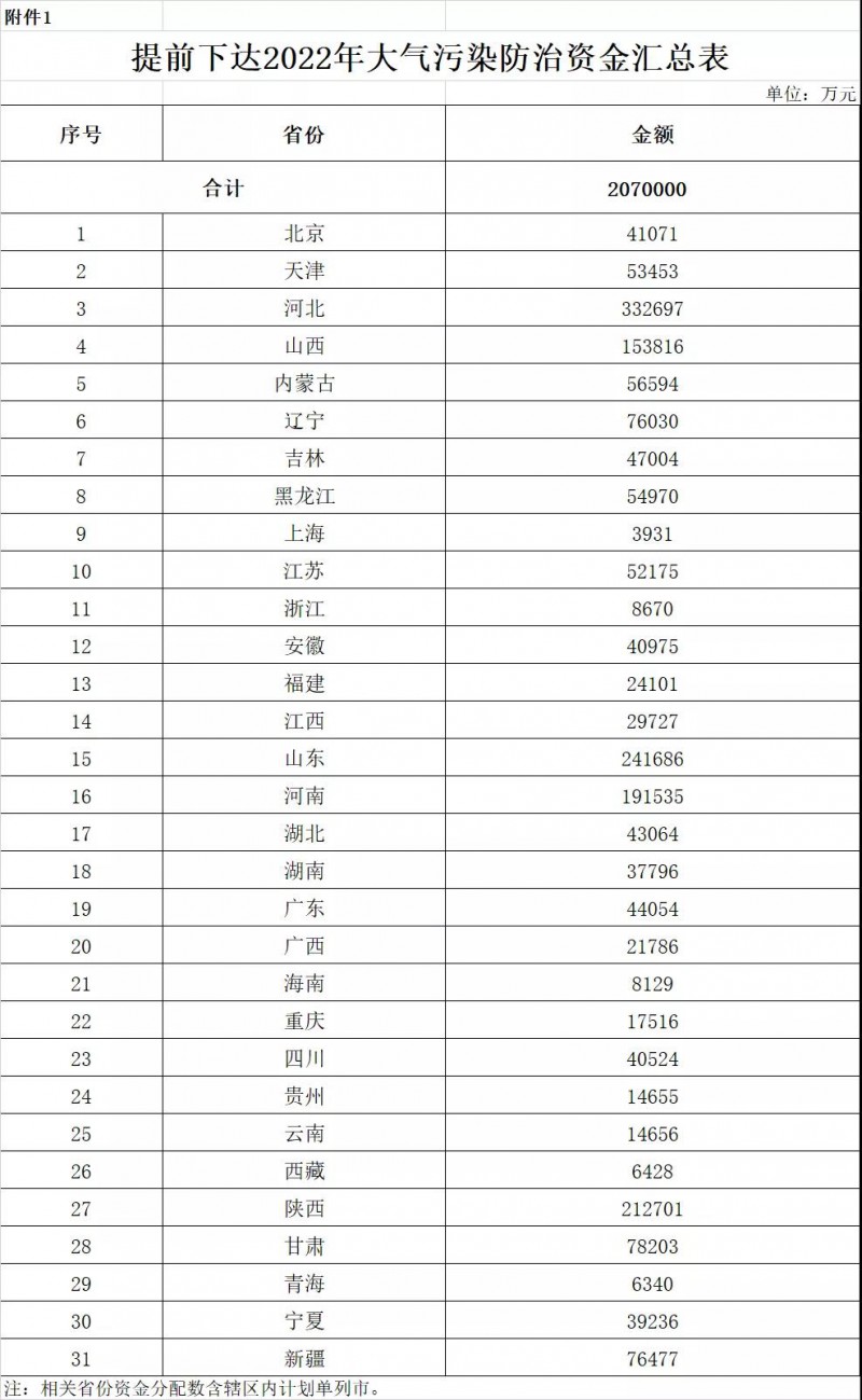 為支持大氣污染防治工作,促進(jìn)大氣質(zhì)量改善,現(xiàn)下達(dá)你省(自治區(qū)、直轄市,以下簡(jiǎn)稱省)2022年大氣污染防治資金,用于支持開展減污降碳等方面相關(guān)工作,并就有關(guān)事項(xiàng)通知如下: