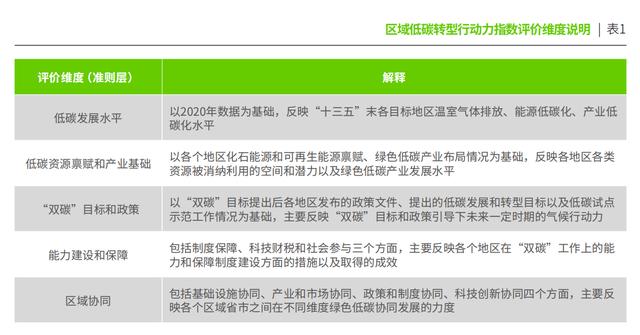 區(qū)域低碳轉(zhuǎn)型行動(dòng)力指數(shù)評(píng)價(jià)維度說(shuō)明。綠色和平供圖