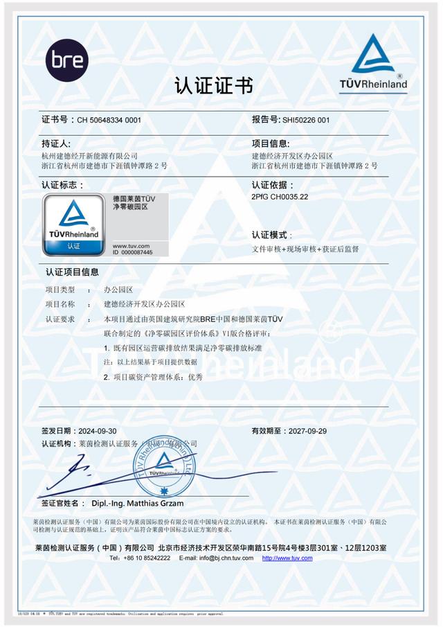 萬幫數(shù)字能源協(xié)助建德經(jīng)濟(jì)開發(fā)區(qū)辦公園區(qū)通過由英國建筑研究院BRE中國和德國萊茵TÜV 聯(lián)合制定的《凈零碳園區(qū)評價(jià)體系》V1版合格評審,并獲項(xiàng)目碳資產(chǎn)管理體系優(yōu)秀級評價(jià)。