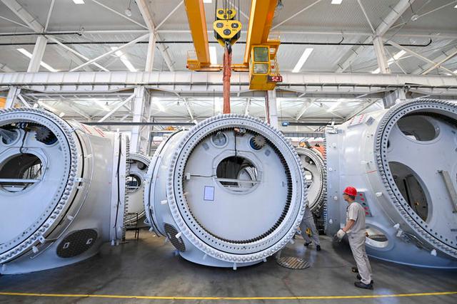 工人在位于山西轉型綜合改革示范區(qū)的太重集團新能源產(chǎn)業(yè)園區(qū)吊運風電裝備(2024年5月30日攝)。新華社記者 楊晨光 攝