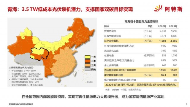 青海具有大規(guī)模發(fā)展光伏獨(dú)特的資源和區(qū)位優(yōu)勢,首先土地資源豐富,同時(shí)陽光燦爛,年日照時(shí)數(shù)3100~3600小時(shí),年輻射量7,000~8,000 MJ/m2,位居全國第二位,僅低于西藏,相同光伏裝機(jī)容量,發(fā)電量較相鄰的甘肅和新疆高出15%~25%;青海接近中國地理中心,便于電力外送;全省光伏裝機(jī)資源潛力3.5TW,是目前全國光伏裝機(jī)總?cè)萘康氖抖啵夥l(fā)電前景廣闊,是我國實(shí)現(xiàn)雙碳目標(biāo)重要的資源支撐。