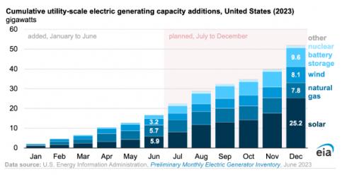 美國開發(fā)商計劃在2023年下半年再建設(shè)35.2吉瓦的新產(chǎn)能,大部分新增容量是太陽能(55%,即19.3吉瓦),其次是電池存能(7.8吉瓦)和風能(4.9吉瓦)。