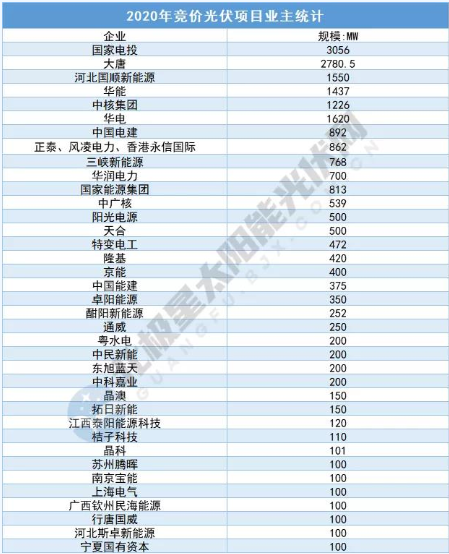(2020年競價(jià)光伏項(xiàng)目規(guī)模超100MW業(yè)主)