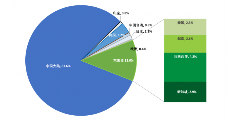 2021年2月,中國(guó)大陸市場(chǎng)的太陽(yáng)能電池片產(chǎn)量占比穩(wěn)定,仍然保持在80%以上