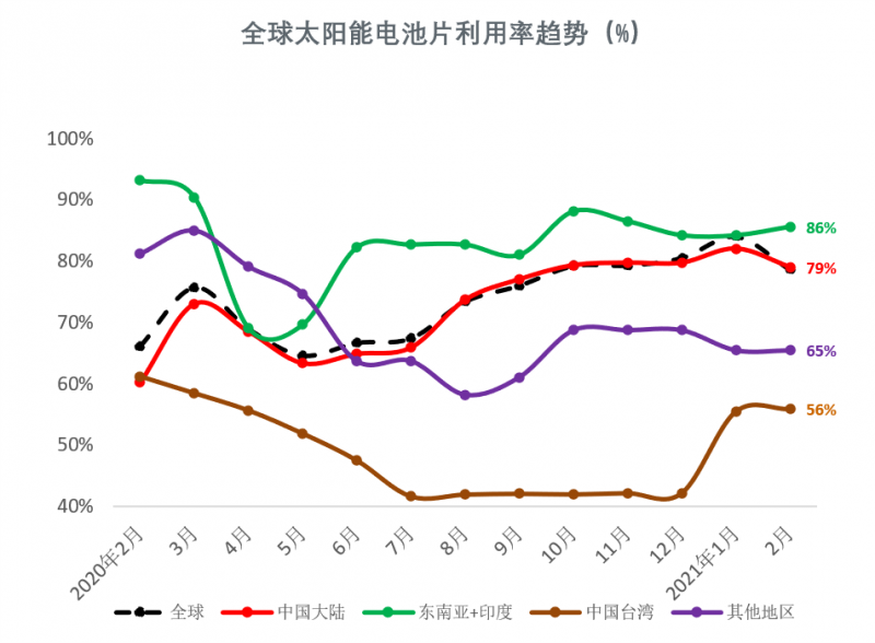 2021年2月,由于中國(guó)市場(chǎng)經(jīng)歷了春節(jié)假期,全球及中國(guó)大陸地區(qū)電池片產(chǎn)能利用率下降至79%