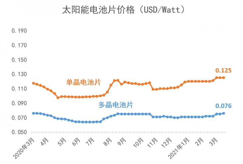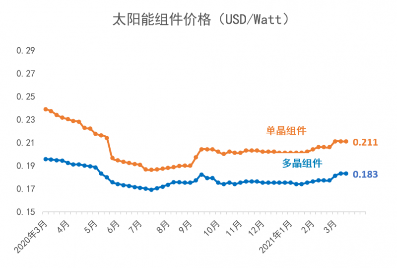 從2021年年初開始,多晶硅短缺的狀況持續(xù)加劇。2021年3月,歷經(jīng)了傳統(tǒng)的春節(jié)假期之后,上游多晶硅環(huán)節(jié)更加供不應(yīng)求,目前的價(jià)格相比于2021年1月6日的價(jià)格已上漲了41%;同時(shí),由于上游多晶用料呈現(xiàn)價(jià)格上漲,硅片端的價(jià)格同時(shí)跳漲。
