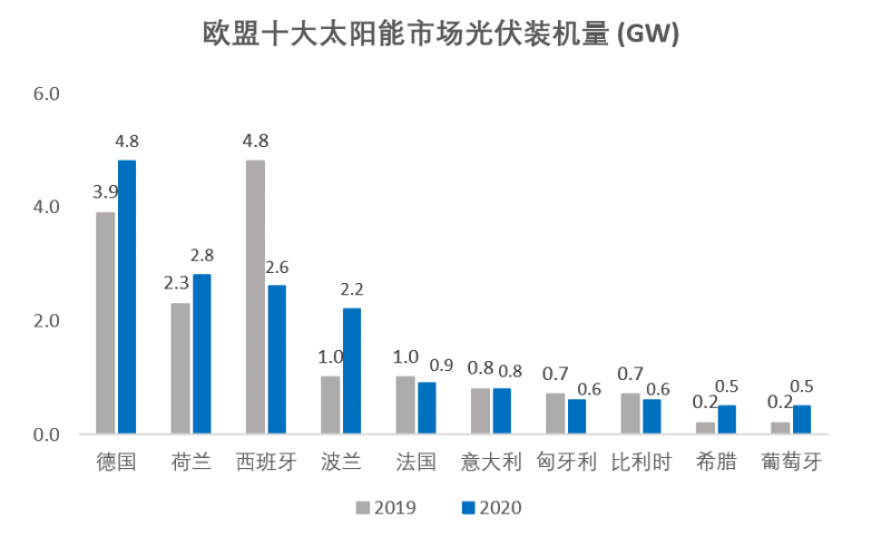 德國(guó)依然是歐洲最大的太陽(yáng)能裝機(jī)市場(chǎng),2020年的光伏裝機(jī)量達(dá)到了4.8GW,而西班牙的光伏裝機(jī)量則由于新冠疫情下的封城影響呈現(xiàn)了大幅下降狀態(tài)
