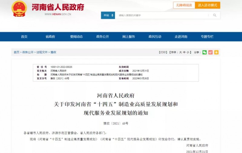 河南省人民政府關(guān)于印發(fā)河南省“十四五”制造業(yè)高質(zhì)量發(fā)展規(guī)劃和現(xiàn)代服務(wù)業(yè)發(fā)展規(guī)劃的通知